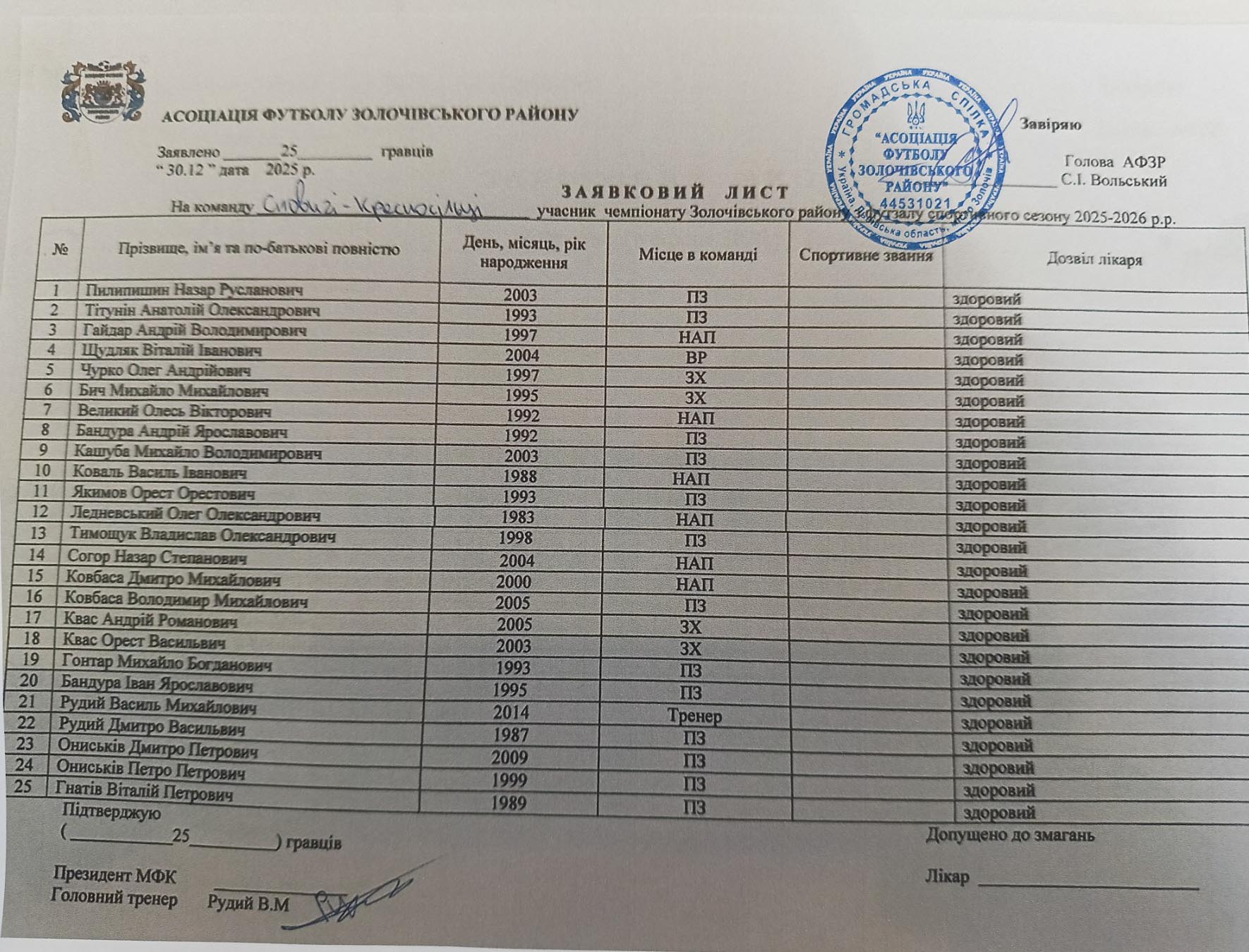 “Надія” (Сновичі-Красносільці) LeaguesФутзал. Золота лігаСезони2026Господаріс. Сновичі ДатаГосподаріРезультатиГостіЧасСтадіон: 2026-02-01 14:00:0101.02.2026“Колос” (В. Вільшаниця) 6 - 7 “Надія” (Сновичі-Красносільці) 14:00:0114:00N/A2026-01-25 13:00:5425.01.2026“Золота липа” (Ремезівці) 13 - 8 “Надія” (Сновичі-Красносільці) 13:00:5413:00N/A2026-01-24 15:00:1424.01.2026“Надія” (Сновичі-Красносільці) 4 - 5 “Динамо” НЦ НГУ (Золочів) 15:00:1415:00N/A2026-01-24 11:00:0824.01.2026“Говерла-2” (Вороняки) 0 - 5 (тех.) “Надія” (Сновичі-Красносільці) 11:00:0811:00N/A2026-01-18 14:00:1118.01.2026“Надія” (Сновичі-Красносільці) 7 - 7 “Говерла” (Вороняки) 14:00:1114:00N/A2026-01-11 13:00:2011.01.2026“Надія” (Сновичі-Красносільці) 0 - 5 (тех.) “Кристал” (Ясенівці) 13:00:2013:00N/A2026-01-10 14:00:2810.01.2026НА НГУ (Золочів) 5 - 8 “Надія” (Сновичі-Красносільці) 14:00:2814:00N/A2026-01-04 14:00:4504.01.2026“Надія” (Сновичі-Красносільці) 7 - 4 “Промінь” (Гончарівка) 14:00:4514:00N/A2026-01-03 18:00:1903.01.2026“Ватра” (Золочівка) 4 - 9 “Надія” (Сновичі-Красносільці) 18:00:1918:00N/A