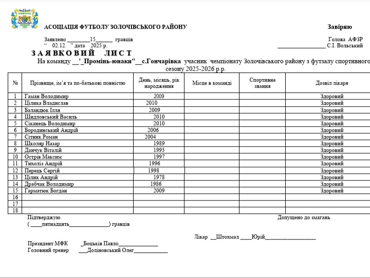 “Промінь” юнаки (Гончарівка) LeaguesФутзал. Срібна ліга, Кубок Золочівського району з футболу 8Х8 серед юнаків U-18, Першість району серед юнаківСезони2024, 2025, 2026ГосподаріСтадіон "Горизонт" (с. Гончарівка) ДатаГосподаріРезультатиГостіЧасСтадіон: 2026-02-28 11:30:5528.02.2026“Сокіл” (Андріївка) 15 - 4 “Промінь” юнаки (Гончарівка) 11:30:5511:30N/A2026-02-21 11:30:4321.02.2026“Промінь” юнаки (Гончарівка) 5 - 4 “Сокіл-2” (Андріївка) 11:30:4311:30N/A2026-02-14 10:30:4514.02.2026“Промінь” юнаки (Гончарівка) 3 - 10 ФК “Утішків” 10:30:4510:30N/A2026-02-07 10:30:4607.02.2026ФК “Скнилів” 8 - 4 “Промінь” юнаки (Гончарівка) 10:30:4610:30N/A2026-01-31 11:30:3431.01.2026“Промінь” юнаки (Гончарівка) 4 - 5 ФК “Задвір’я” 11:30:3411:30N/A2026-01-24 11:00:1924.01.2026“Промінь” юнаки (Гончарівка) 1 - 8 “Сокіл” (Андріївка) 11:00:1911:00N/A2026-01-17 11:00:0017.01.2026“Сокіл-2” (Андріївка) 7 - 7 “Промінь” юнаки (Гончарівка) 11:00:0011:00N/A2026-01-03 10:30:5903.01.2026ФК “Утішків” 9 - 6 “Промінь” юнаки (Гончарівка) 10:30:5910:30N/A2025-12-27 10:30:5927.12.2025“Промінь” юнаки (Гончарівка) 8 - 9 ФК “Скнилів” 10:30:5910:30N/A2025-12-20 11:30:0320.12.2025ФК “Задвір’я” 10 - 3 “Промінь” юнаки (Гончарівка) 11:30:0311:30N/A2025-08-23 11:50:0123.08.2025“Промінь” юнаки (Гончарівка) 5 - 0 ФК “Задвір’я” (юнаки) 11:50:0111:50N/A2025-08-23 10:00:5123.08.2025“Сокіл” Андріївка (юнаки) 5 - 1 “Промінь” юнаки (Гончарівка) 10:00:5110:00N/A2024-10-06 15:30:4906.10.2024“Говерла” юнаки (Вороняки) 2 - 0 “Промінь” юнаки (Гончарівка) 15:30:4915:30N/A2024-09-08 11:00:2908.09.2024ФК “Красне” (юнаки) 1 - 2 “Промінь” юнаки (Гончарівка) 11:00:2911:00N/A2024-08-31 10:30:2431.08.2024“Промінь” юнаки (Гончарівка) 9 - 2 ФК “Задвір’я” (юнаки) 10:30:2410:30N/A2024-08-03 18:00:2103.08.2024“Сокіл” Андріївка (юнаки) 2 - 0 “Промінь” юнаки (Гончарівка) 18:00:2118:00N/A2024-07-28 15:00:1528.07.2024“Промінь” юнаки (Гончарівка) 1 - 4 “Ватра” юнаки (Золочівка) 15:00:1515:00N/A2024-07-06 17:00:1106.07.2024ФК “Задвір’я” (юнаки) 0 - 2 “Промінь” юнаки (Гончарівка) 17:00:1117:00N/A2024-06-22 17:00:4822.06.2024“Ватра” юнаки (Золочівка) 3 - 0 “Промінь” юнаки (Гончарівка) 17:00:4817:00N/A2024-06-16 11:00:4916.06.2024“Промінь” юнаки (Гончарівка) 5 - 2 ФК “Красне” (юнаки) 11:00:4911:00N/A2024-06-08 17:00:1208.06.2024“Промінь” юнаки (Гончарівка) 3 - 5 “Сокіл” Андріївка (юнаки) 17:00:1217:00N/A2024-05-26 11:00:0826.05.2024“Промінь” юнаки (Гончарівка) 0 - 1 “Говерла” юнаки (Вороняки) 11:00:0811:00N/A