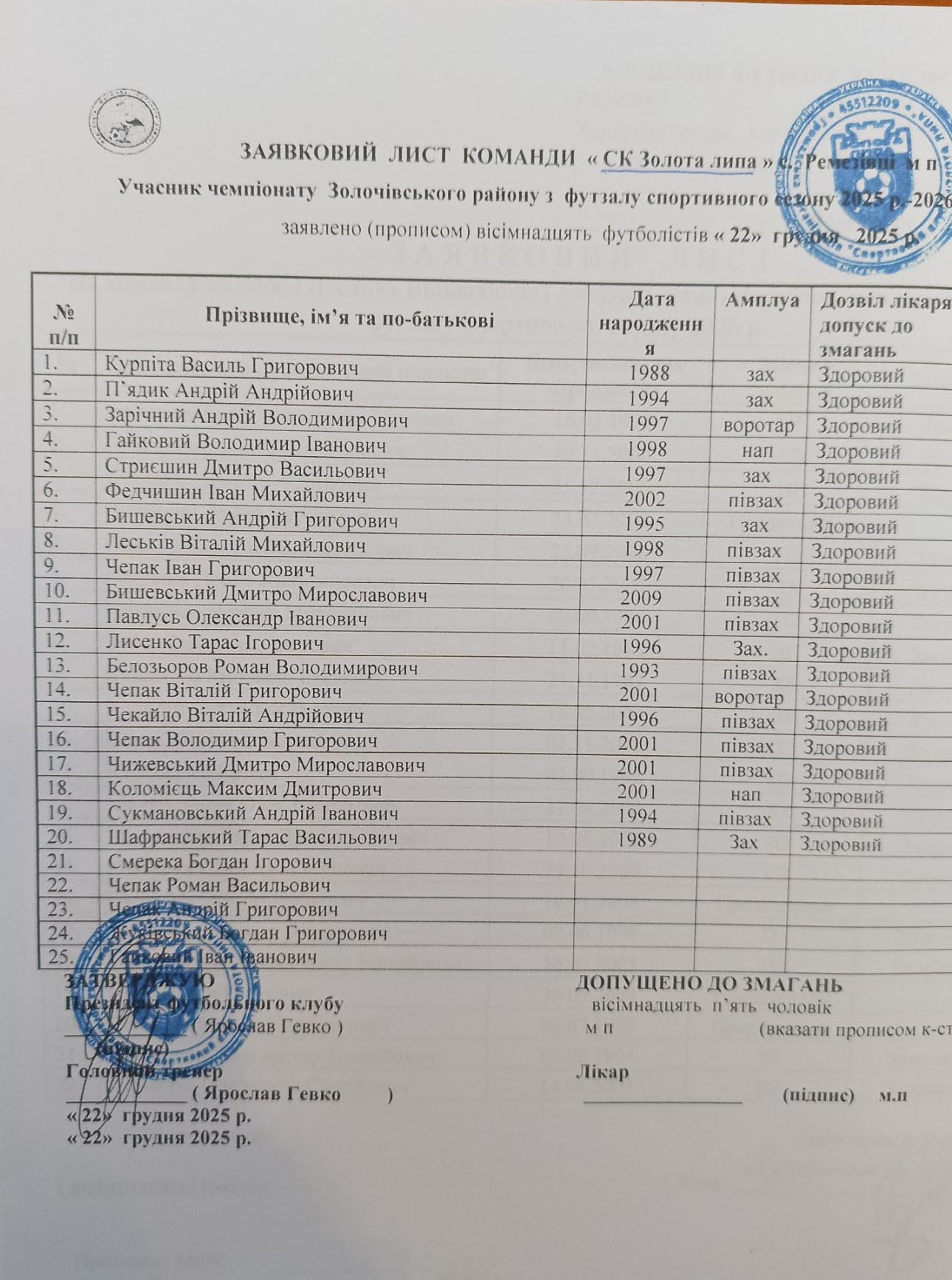 - Чемпіонат Золочівського району. Перша ліга, Чемпіонат Золочівського району. Прем'єр-ліга, Благодійний чемпіонат - 2022, Благодійний турнір з футболу на підтримку ЗСУ, Чемпіонат Золочівського району з футболу. Попередній етап, Футзал. Золота ліга, Кубок ліги, Кубок осені, Кубок східних Федерацій футболу Львівщини, Кубок весни Золочівського району, Кубок Золочівського району, Кубок Золочівського району з футболу, Ліга чемпіонів Золочівського району, Малий кубок району, Меморіал пам'яті І. Г. Вольського, Суперкубок району, Турнір пам'яті Віталія Кучера, Турнір пам'яті Володимира Малюги