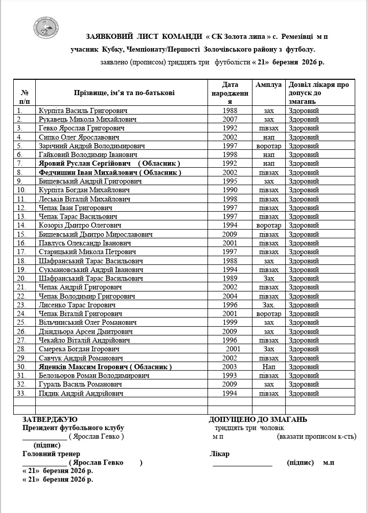 - Чемпіонат Золочівського району. Перша ліга, Чемпіонат Золочівського району. Прем'єр-ліга, Благодійний чемпіонат - 2022, Благодійний турнір з футболу на підтримку ЗСУ, Чемпіонат Золочівського району з футболу. Попередній етап, Футзал. Золота ліга, Кубок Кубків Золочівського району, Кубок ліги, Кубок осені, Кубок східних Федерацій футболу Львівщини, Кубок весни Золочівського району, Кубок Золочівського району, Кубок Золочівського району з футболу, Ліга чемпіонів Золочівського району, Малий кубок району, Меморіал пам'яті І. Г. Вольського, Суперкубок району, Турнір пам'яті Віталія Кучера, Турнір пам'яті Володимира Малюги